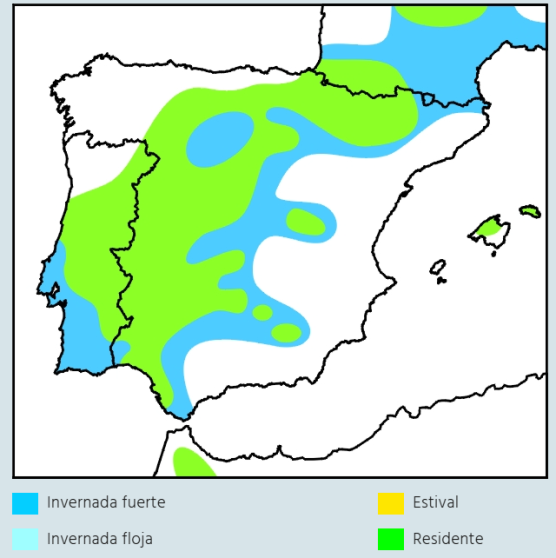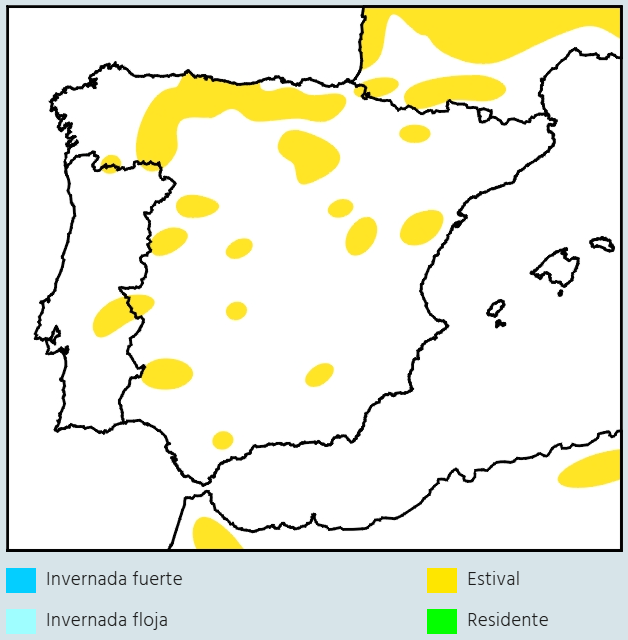 Amenazas: a dversas condiciones ambientales (sequias) en las áreas de invernada africanas. Distribución: aparece de forma continua y extensa desde Zamora hasta Soria a través de la costa y la Cordillera Cantábrica.