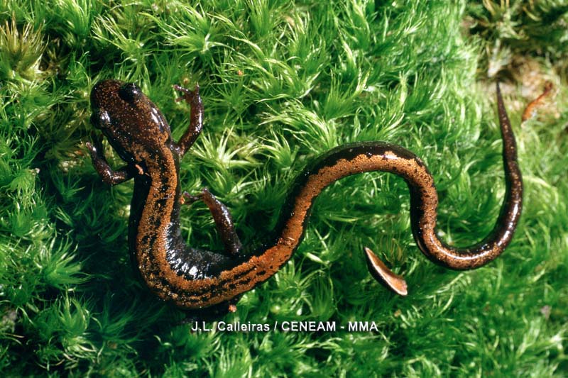 Protección : CEEA: Vulnerable Ecología: Salamandra con cuerpo muy alargado, cabeza aplastada, extremidades cortas y una longitud total de hasta 16 cm. Su cola, cuando no está regenerada, es especialmente larga, alcanzando longitudes que duplican la longitud de cabeza y cuerpo. La piel es lisa y reluciente. Coloración de pardo oscuro a negro, con dos bandas dorsolaterales de color bronceado o cobrizo que se extienden por todo el cuerpo y fusionan en las partes posteriores de la cola. Hábitat: Generalmente vive en elevaciones de baja o media altitud, faltando por encima de los 1.000 m de altitud. Prefiere arroyos con acidez elevada. Vive en hábitats montañosos o con topografía accidentada, y depende de la presencia de arroyos limpios, se pueden encontrar igualmente en bosques caducifolios, tojales y lugares rocosos prácticamente sin vegetación. Amenazas: Las principales amenazas para la especie son la contaminación de arroyos y (en zonas secas) la desviación de aguas para fines agrícolas y la destrucción de ciertos lugares concretos de reproducción puede constituir un problema adicional para determinadas poblaciones. Distribución: Endemismo de la Península Ibérica y único representante de su género.